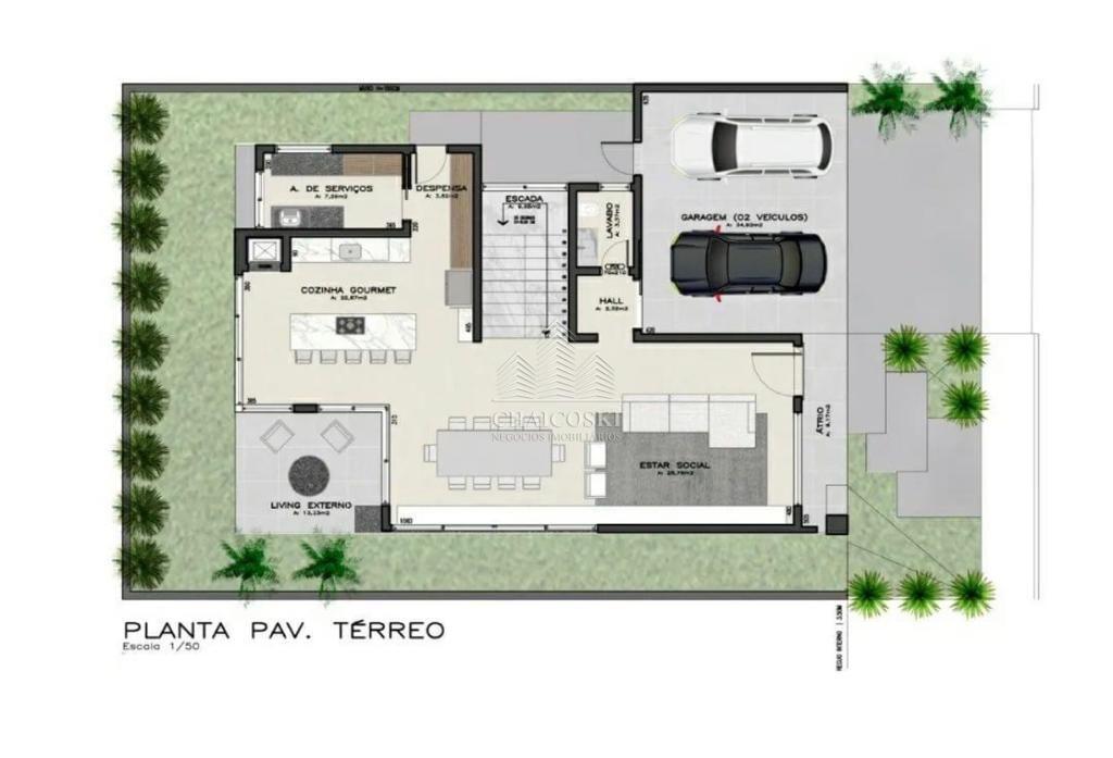 cozinha gourmet (c/ churrasqueira), área de serviço, depósito/despensa. Garagem: vagas cobertas (2 carros).