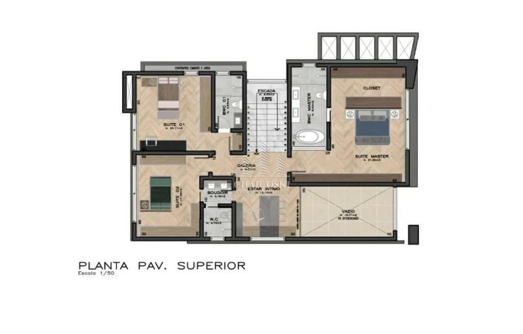 SEGUNDO PAVIMENTO: mezanino, 4 suítes sendo 1 suíte máster com closet + banheiro com cuba e chuveiro duplo + banheira imersão, uma suíte ampla e 2 Demi-suítes podendo ser visível para home Office/estar Intimo.