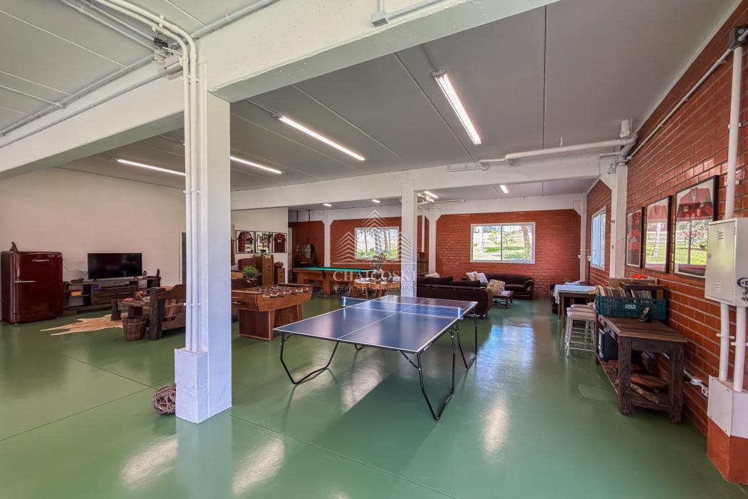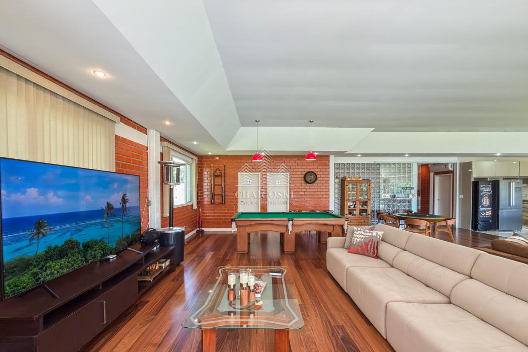 No pavimento inferior, a área de lazer foi projetada para recepções de grande porte. O espaço gourmet com churrasqueira integra-se a um salão amplo, com mesas de sinuca, ping-pong e jogos, além de mobiliário rústico de alta qualidade. A estrutura comporta com facilidade 30, 40 ou até 50 pessoas, mantendo circulação fluida e organização.
