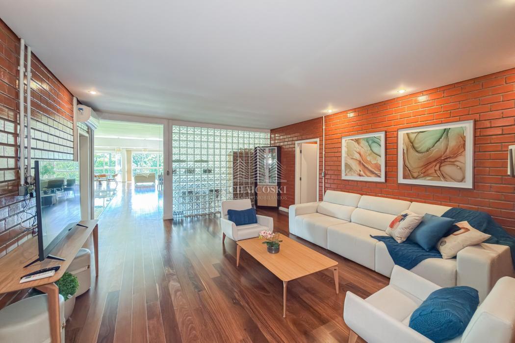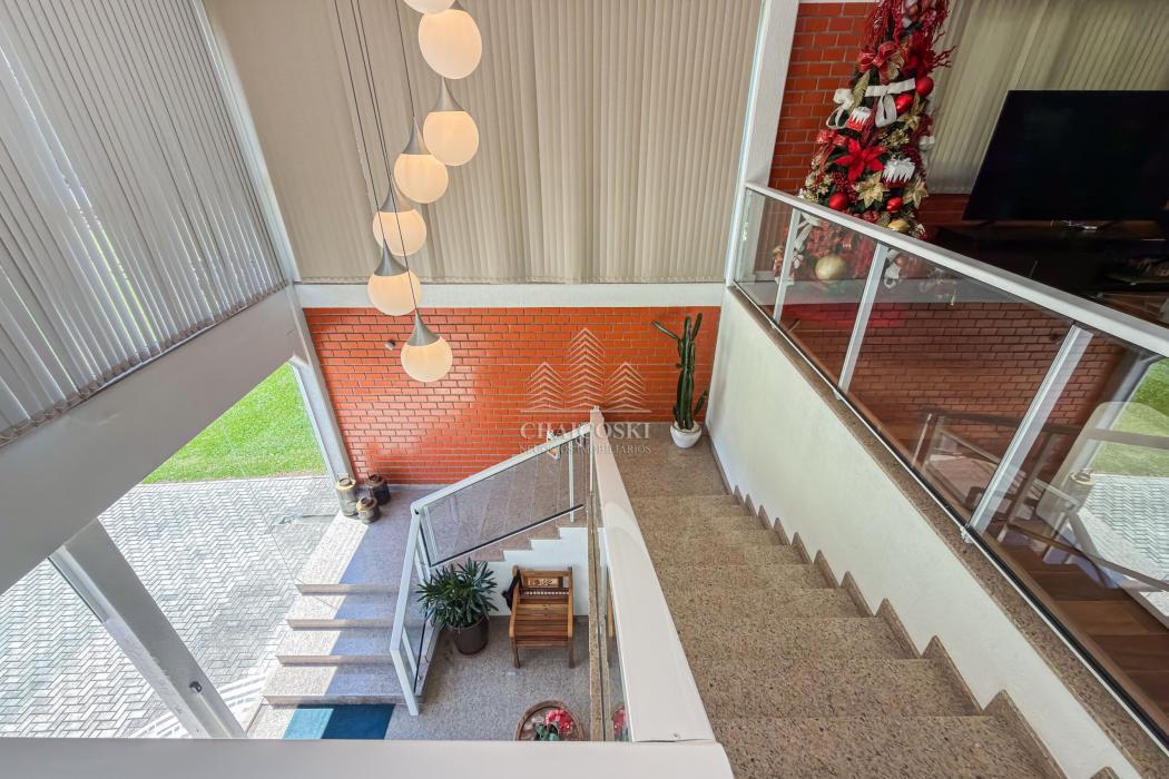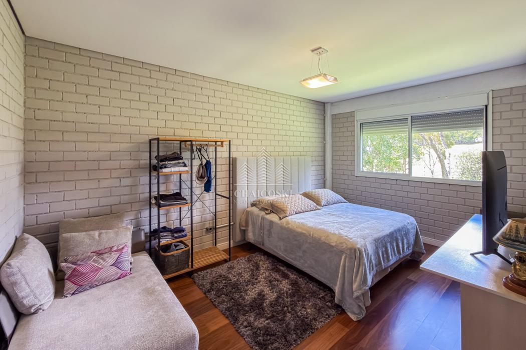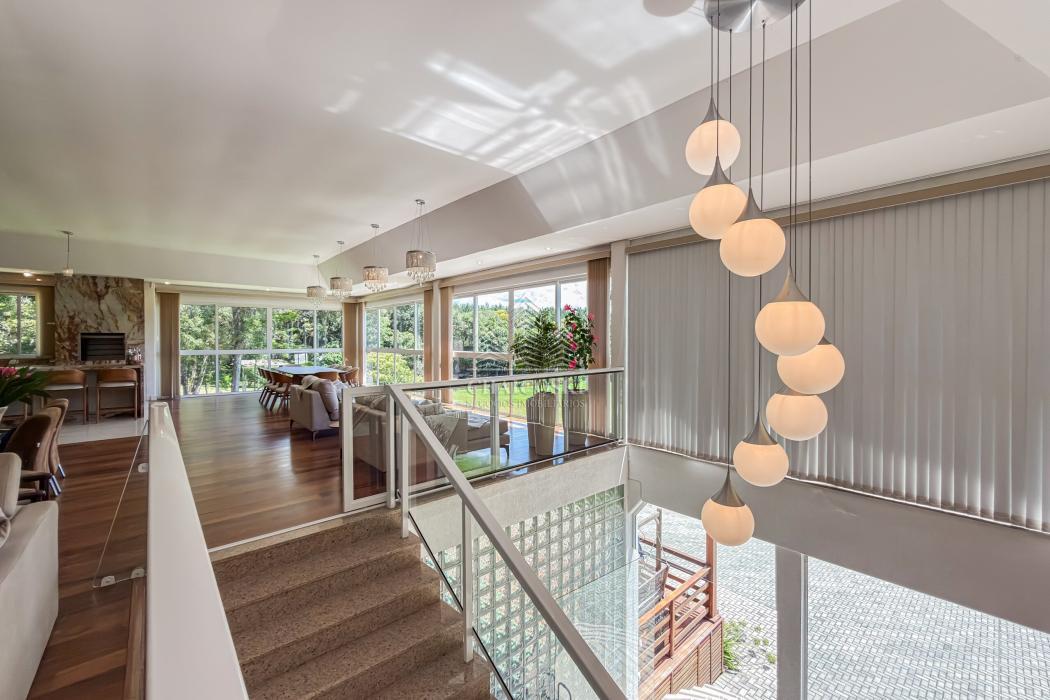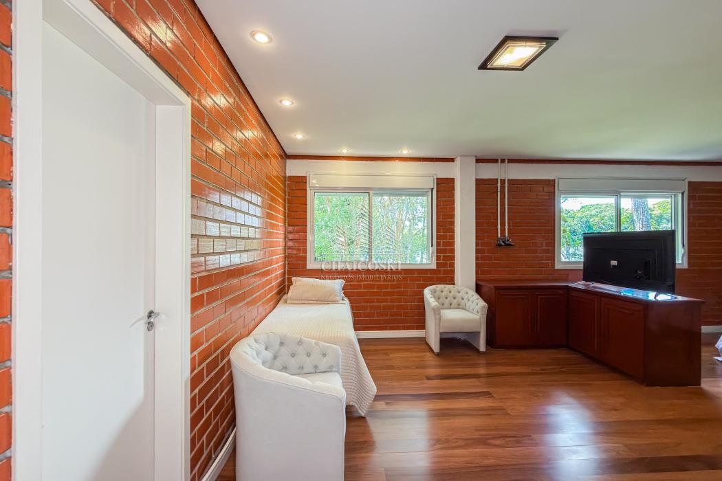 A residência principal possui mais de 700 m² de área construída, com padrão construtivo robusto e manutenção impecável. No pavimento superior estão quatro suítes amplas, incluindo uma suíte master, garantindo privacidade e organização na área íntima.