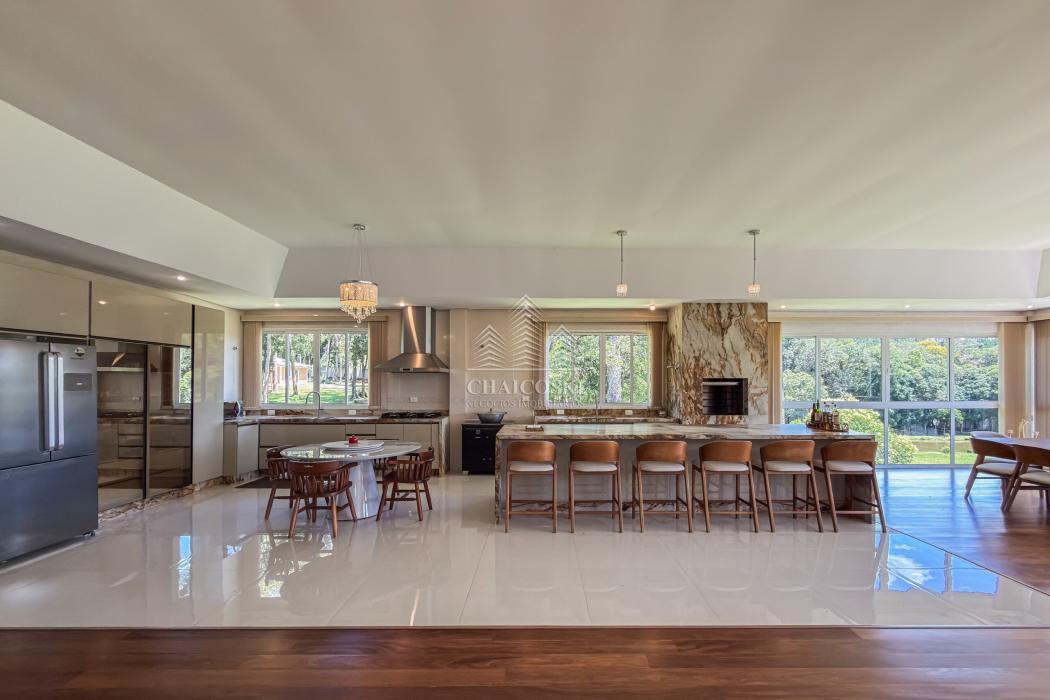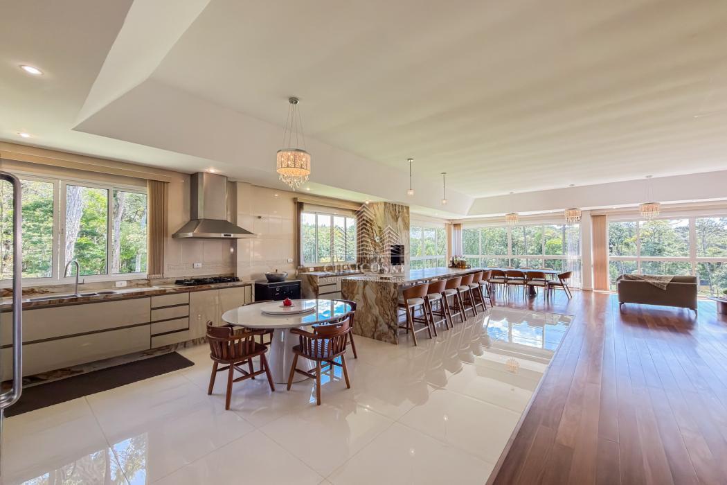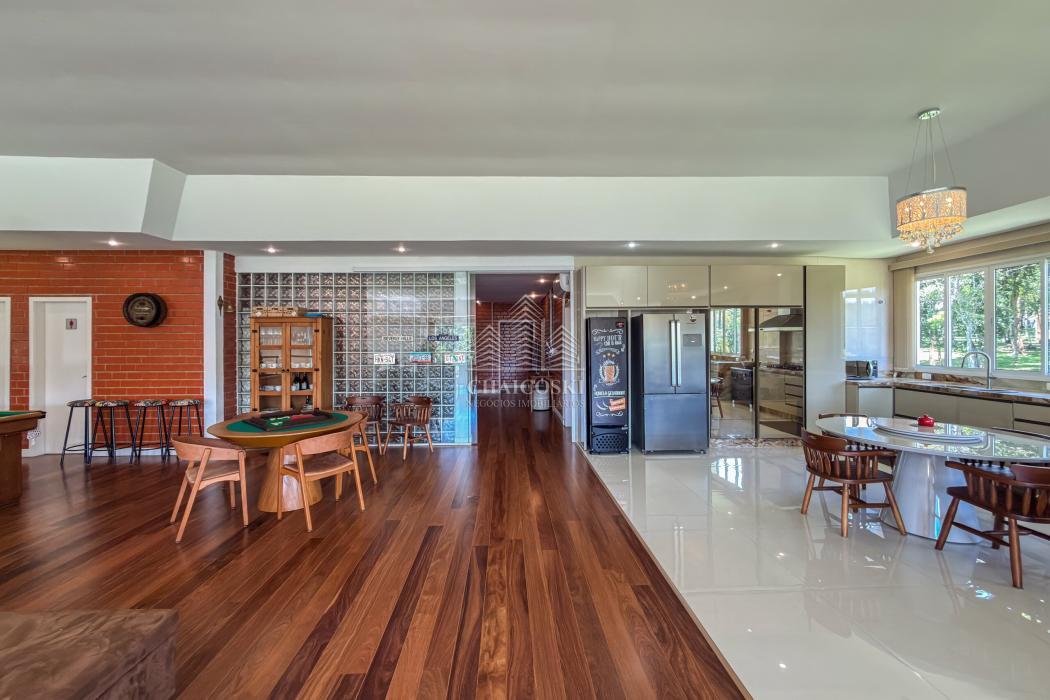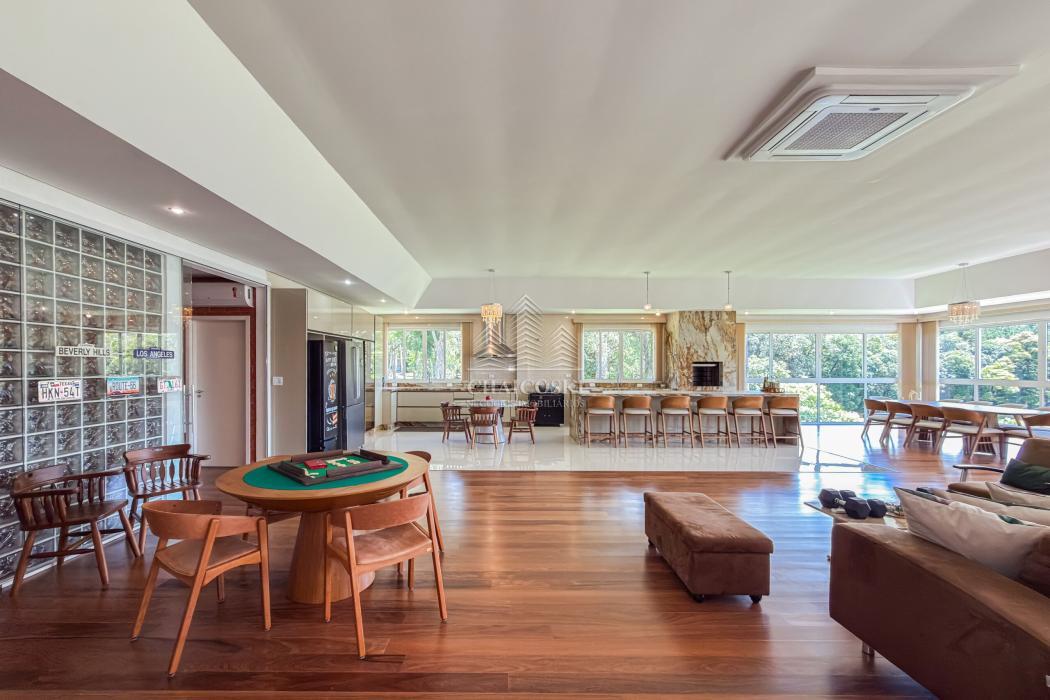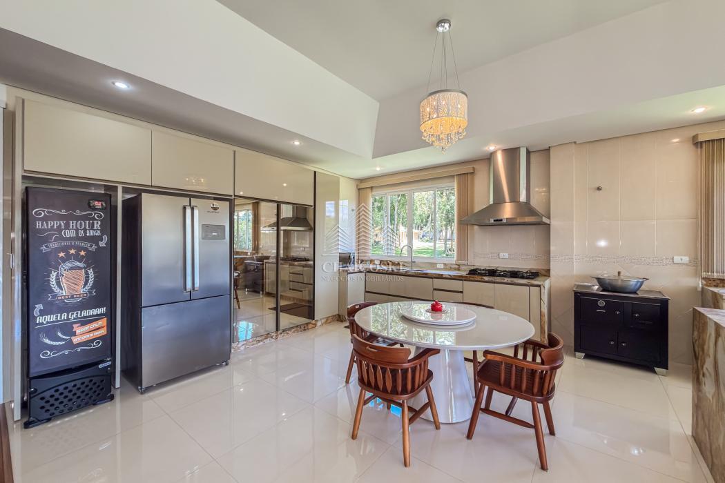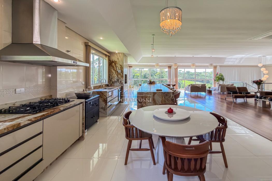 Neste mesmo nível encontra-se um dos grandes diferenciais da propriedade: uma cozinha gourmet completa, planejada, mobiliada e equipada com churrasqueira, integrada a uma ampla sala de jantar. Um ambiente desenhado para receber com elegância, onde convivência e funcionalidade caminham juntas.